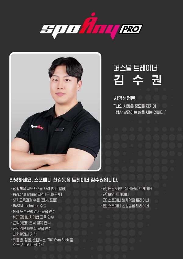 안녕하세요. 스포애니 신길동점 PRO 김수권 트레이너 입니다.
