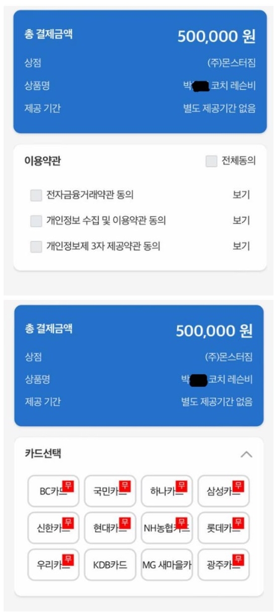 회원이 PT레슨비 또는 멤버쉽 비용을 일시불 또는 무이자 할부 중에 선택하시어 결제하시면 결제가 완료됩니다. 센터, 코치, 회원 어느 누구도 앱설치가 필요없으며, 회원 입장에서는 회원가입 없이도 이용가능합니다.