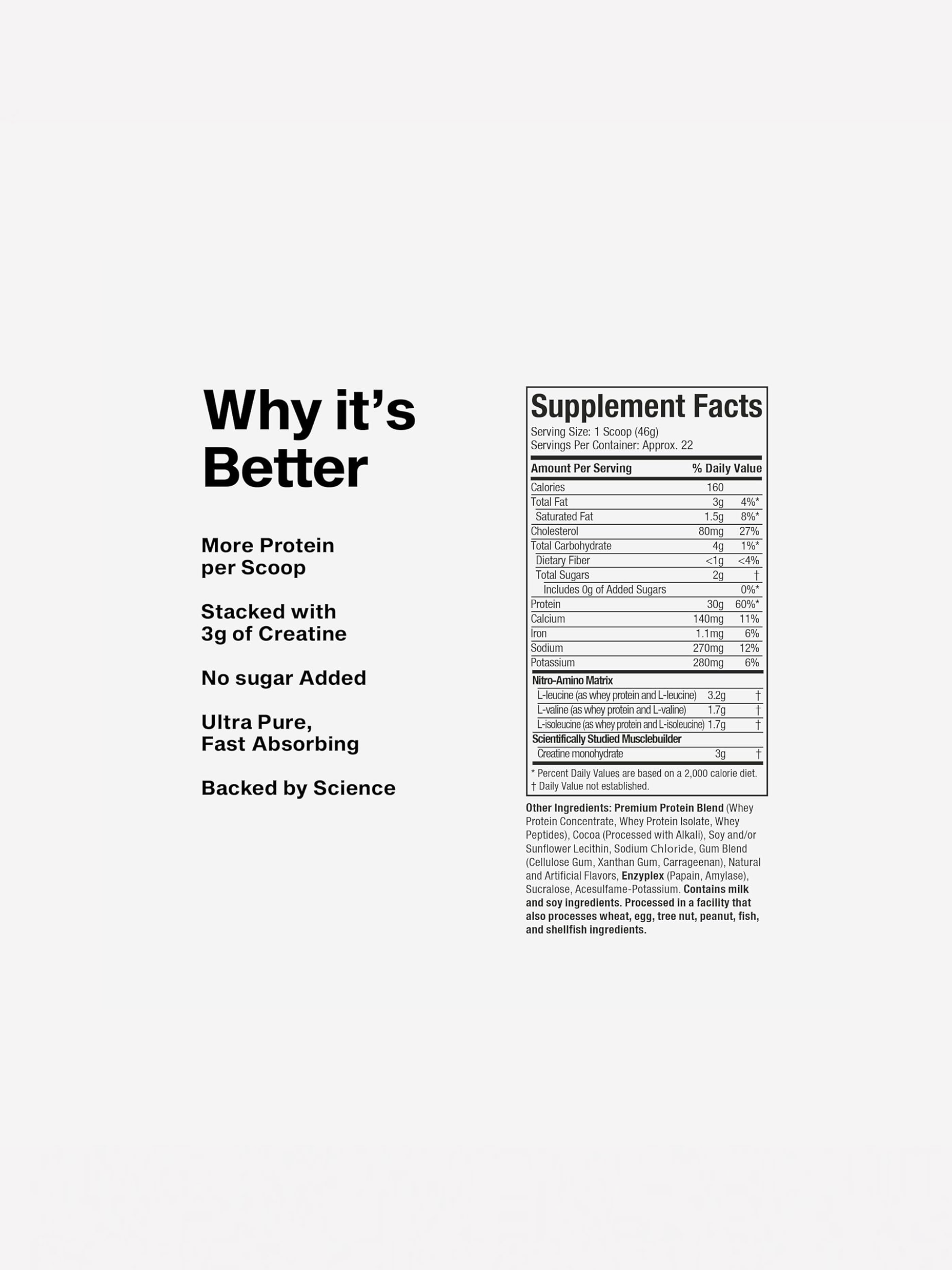 Ingredients: Whey Protein Blend (Whey Protein Concentrate, Whey Protein Isolate, Hydrolyzed Whey Protein), Cocoa (Processed with Alkali), Salt, Soy and/or Sunflower Lecithin, Natural and Artificial Flavors, Sucralose, Gum Blend (Guar Gum, Gum Acacia, Xanthan Gum), Steviol Glycosides. Contains milk and soy ingredients. Processed in a facility that also processes eggs, peanuts, wheat, tree nuts, fish, crustacean shellfish and sesame ingredients.