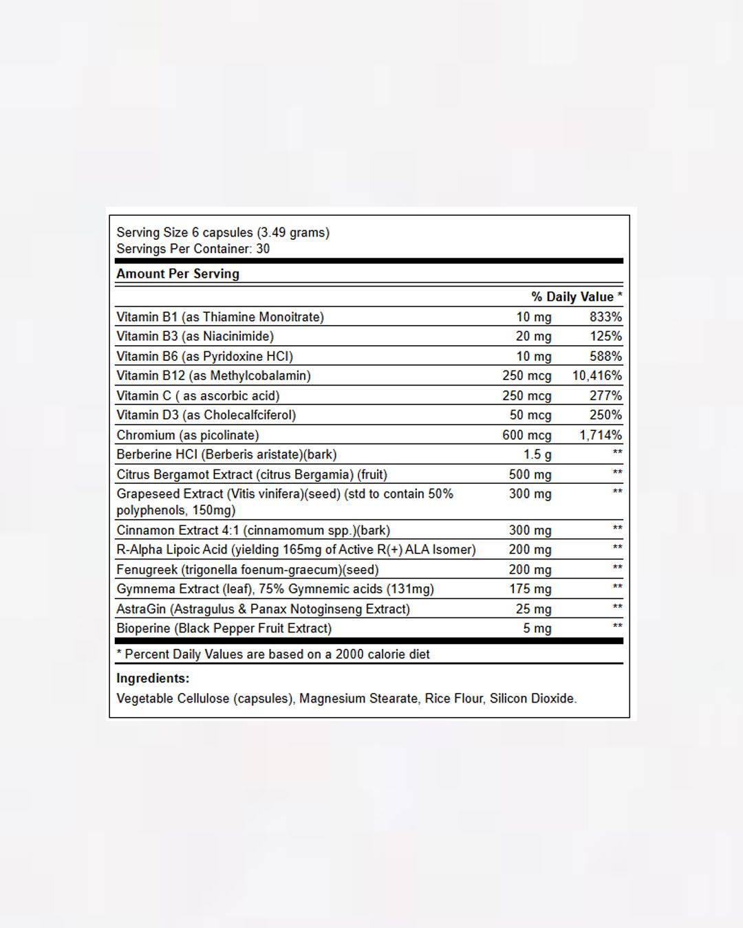 베르베린(Berberine) HCl, 크롬, R-알파 리포산, 시나몬 껍질 추출물이 배합되어 대사 밸런스를 지원합니다. 또한 짐네마 잎 추출물이 포함되어 전반적인 신체 항상성 유지에 시너지를 더합니다.